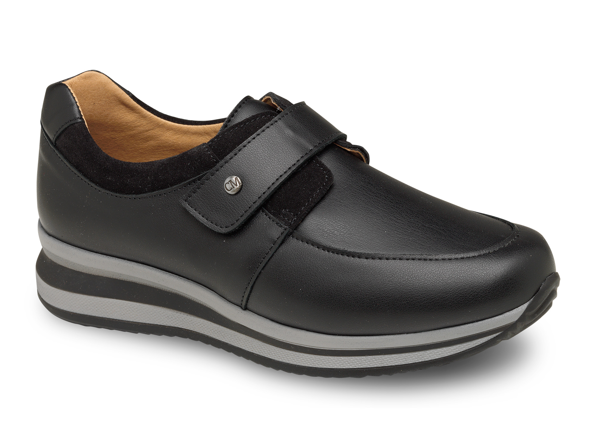 Chaussure de largeur spéciale 14I, réalisée avec des matériaux élastiques en simili cuir sur la tige, qui réduisent l'inconfort causé par les orteils en griffe et les orteils en marteau, puisque l'innovation de ces matériaux réduit la pression et la friction dans les points ou zones délicates et douloureuses, s'adaptant aux déformations qui les pieds peuvent avoir sans les abîmer. Il comprend une semelle intérieure anatomique amovible pour pouvoir s'adapter à la semelle intérieure du client.