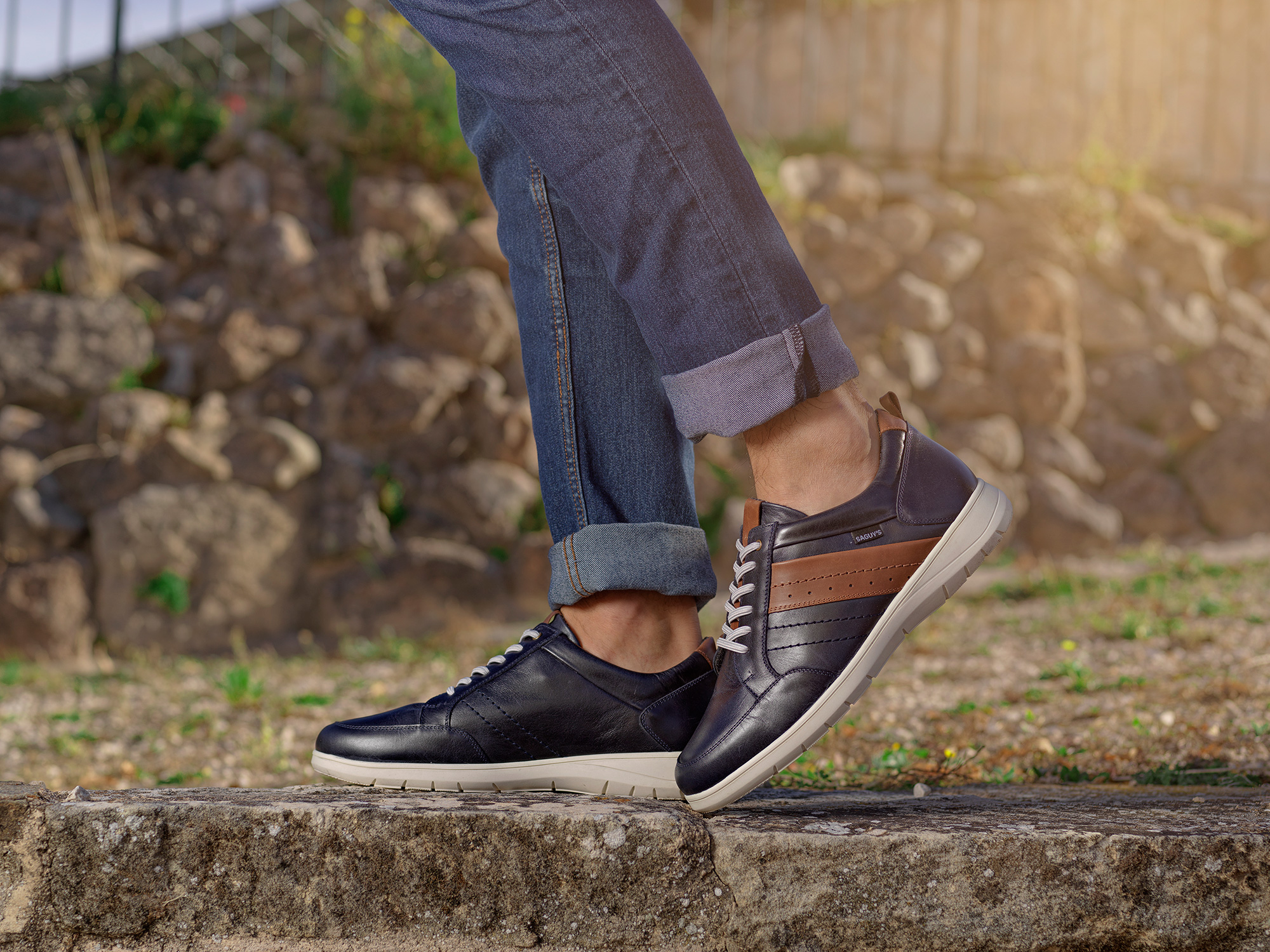 Calzado sport para caballero, fabricado con materiales de alta calidad en tonos azules y marrones, una combinación perfecta entre diseño y moda.