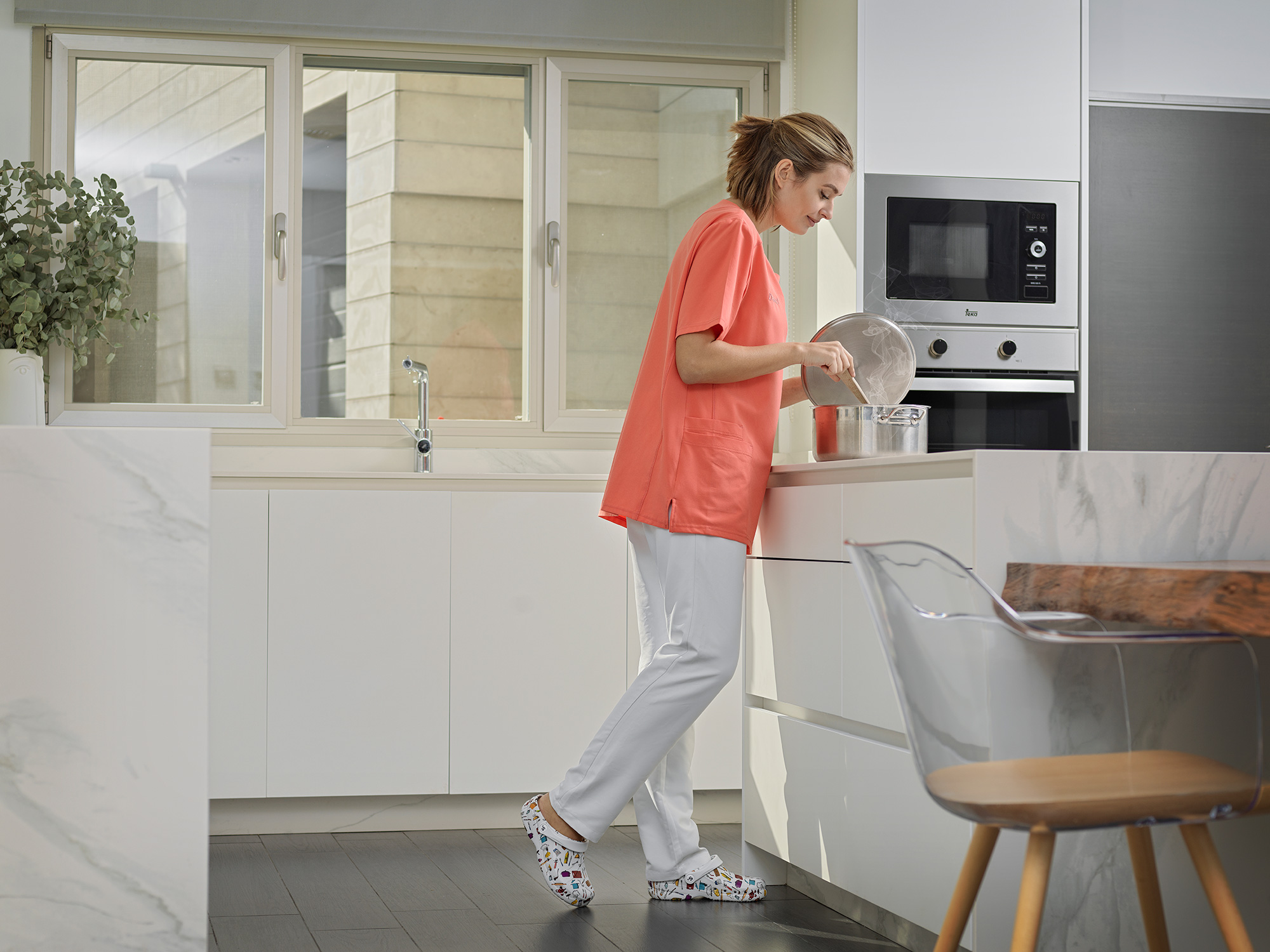 Zuecos ultraligeros y estampados para el sector sanitario y de la hostelería. Fabricados con una correa posterior abatible para un mayor ajuste y perforaciones en los laterales para favorecer la transpiración. Ideal para trabajos en los que se precisa estar muchas horas de pie o en la misma posición.