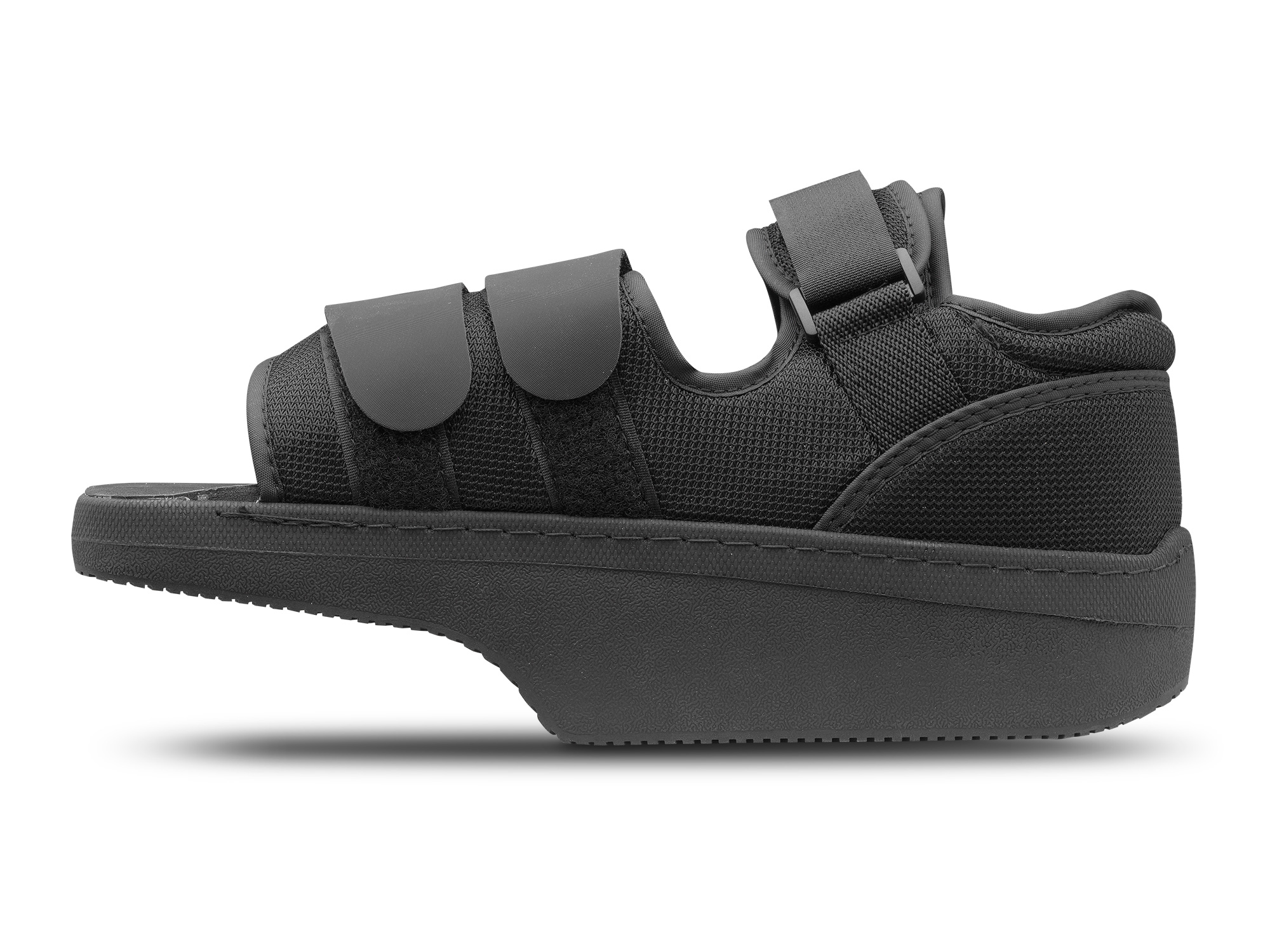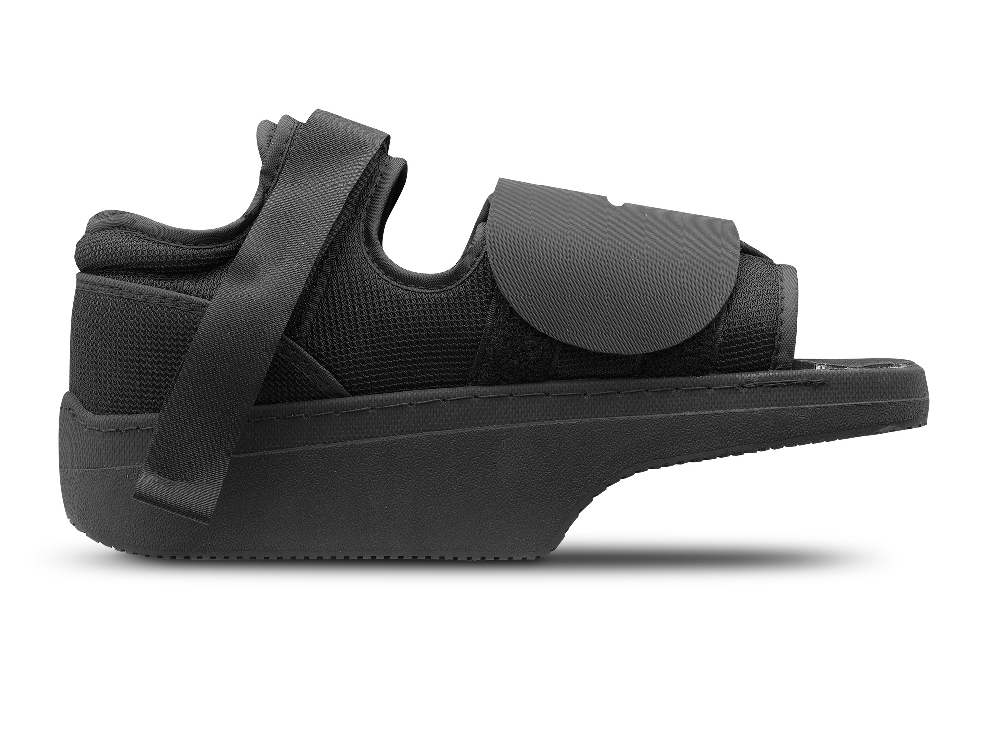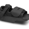 Calzado de diseño de cuña corta que mantiene el peso por detrás de los puntos de apoyo, reduciendo así, la presión del antepie. Con este calzado, las ulceraciones de debajo de las cabezas de los metatarsianos y los pies, sanan más rápido después de procedimientos quirúrgicos, con o sin clavos, placas o tornillos. Cierre mediante velcro para facilitar su uso.