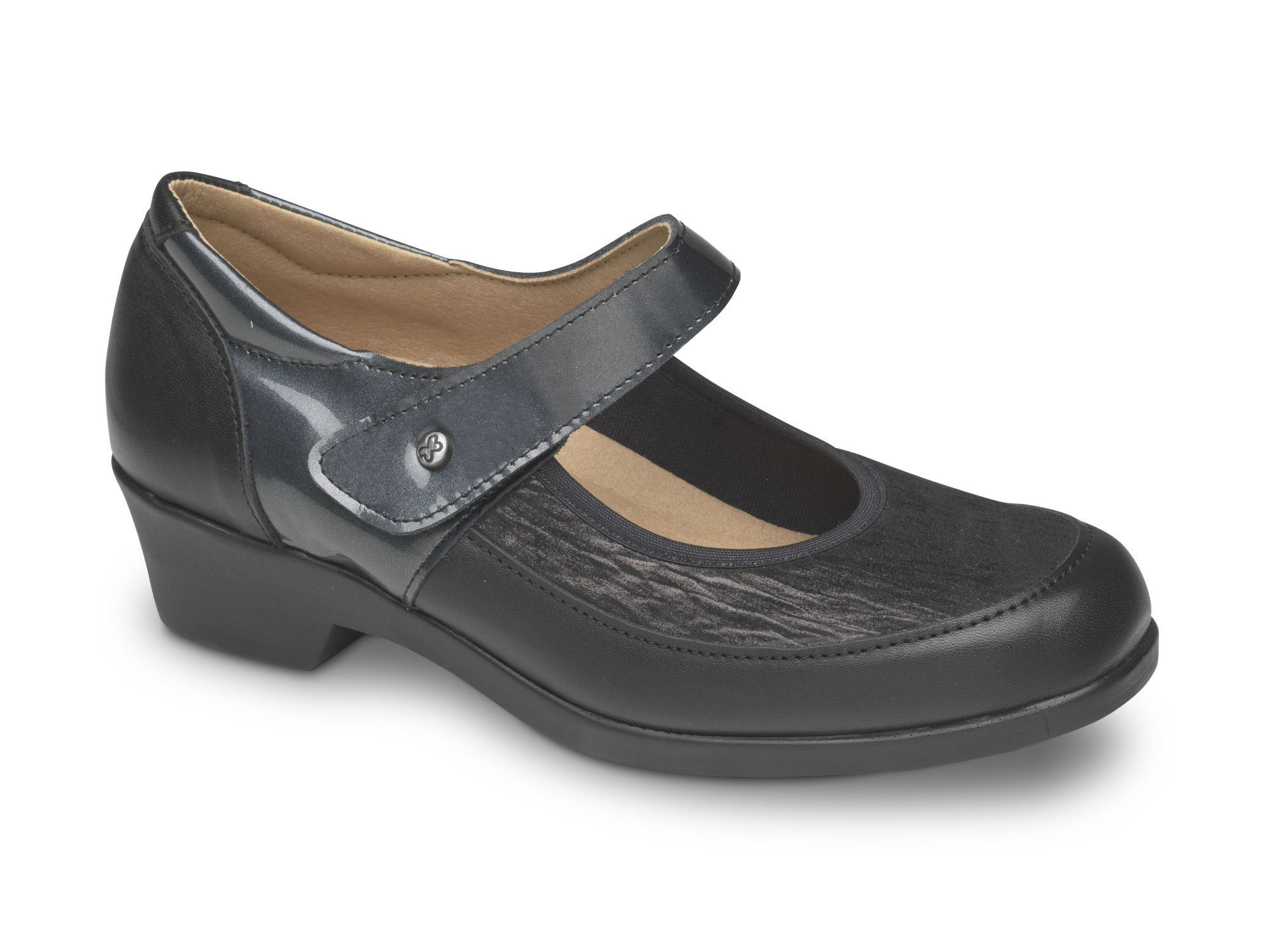 Zapato ideal para pies sensibles, diseñado con pala y lateral de material elástico que se adapta a la forma del pie, proporcionando alivio para juanetes y dedos en garra o martillo. Su ancho especial, la plantilla extraíble y el cierre de velcro garantizan un ajuste perfecto y máxima comodidad. Además, su suela con pequeño tacón, proporciona una elevación ligera aportando a su vez estabilidad y elegancia en cada paso.