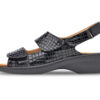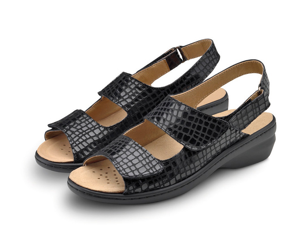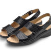 Sandalia diseñada con dos palas con cierre de velcro en la parte delantera que junto con el cierre trasero permite una sujeción óptima del pie. Está fabricada en pieles de primera calidad y laminados que con la suela de cuña, de material muy ligero, hacen una combinación muy fresca y actual para lucir este verano. Es ideal para mujeres que necesitan un zapato cómodo y sujeto, a la vez que lucen la última moda.