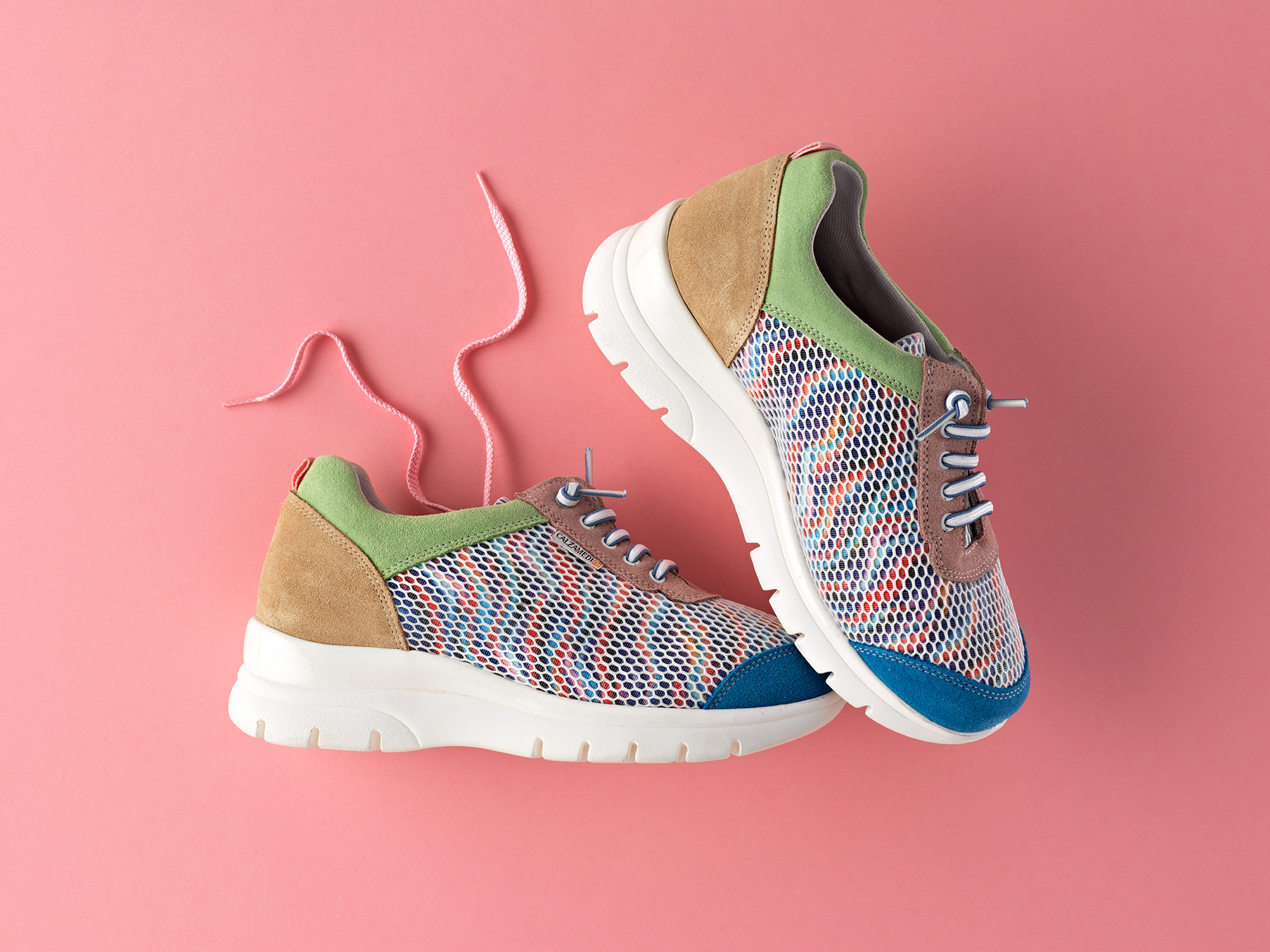 Zapatilla deportiva de vivos colores. En su fabricación combina rejilla transpirable estampada y piezas de serraje de alegres colores que combinan con cualquier prenda de vestir informal. Su forro interno se compone de textiles muy suaves que absorben la costuras, haciéndolo el calzado perfecto, para pies delicados, para el cualquier época del año. Su ancho especial para pie diabético, juanetes y dedos en garra o martillo, es sin duda lo que tus pies necesitan. Disfruta de estilo sin renunciar a la comodidad.