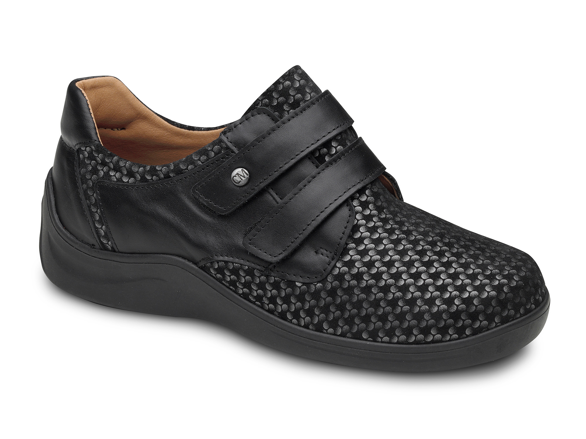 Zapato de ancho especial 16M, fabricado en la pala con materiales elásticos, muy suaves y de bonitos diseños, que reducen las molestias ocasionadas por los juanetes, dedos en garra y dedos martillo, ya que la innovación de estos materiales disminuye la presión y el roce en los puntos o zonas delicadas y dolorosas adaptándose a las deformidades que puedan tener los pies sin dañarlos. Tiene peso muy ligero y gran apertura que facilita la puesta en el pie en personas que padecen linfedemas, pies diabéticos y reumáticos.