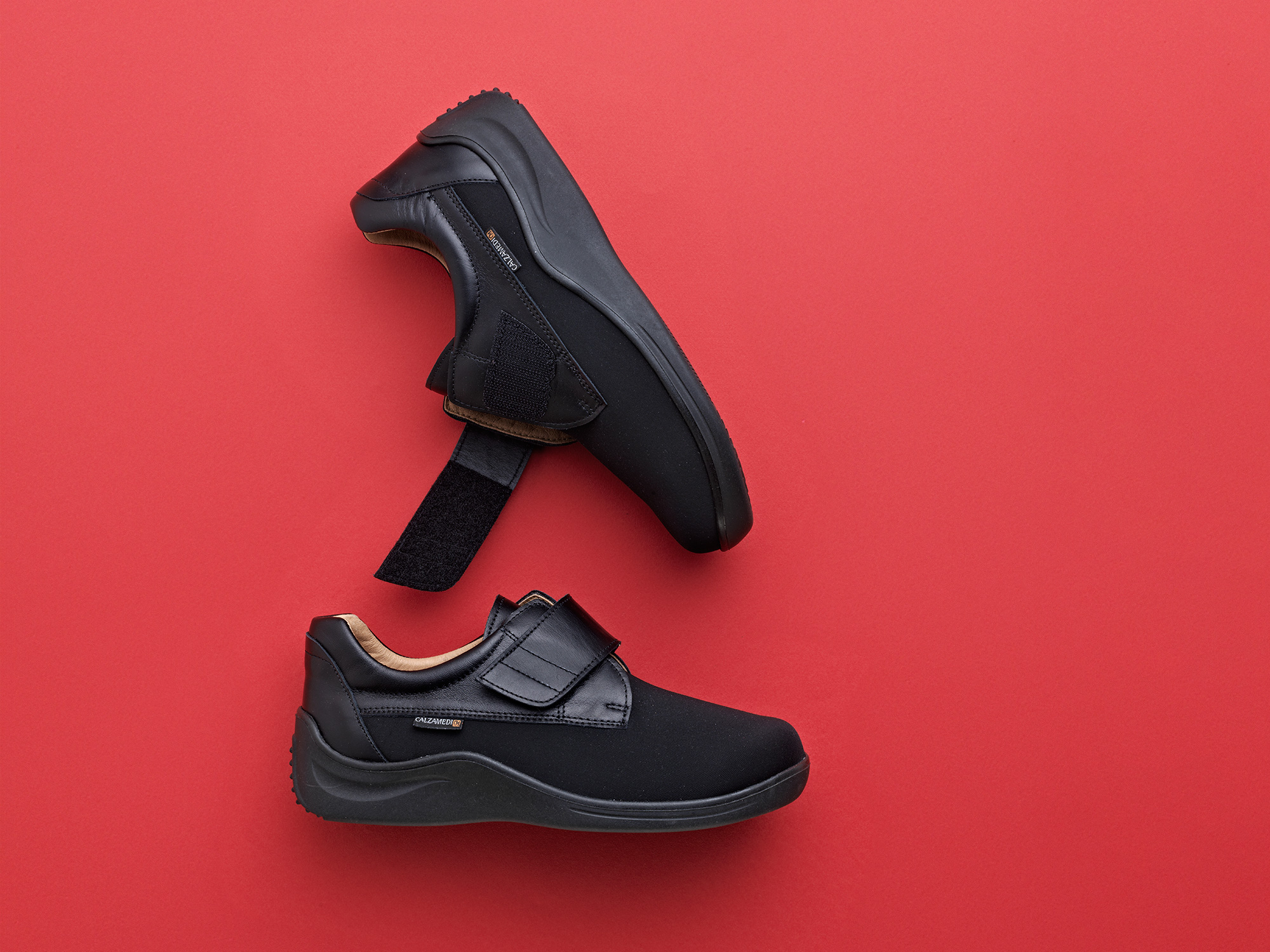 Zapato de ancho especial 16M, fabricado con materiales elásticos muy suaves en la pala, que reducen las molestias ocasionadas por los juanetes, dedos en garra y dedos martillo, ya que la innovación de estos materiales disminuye la presión y el roce en los puntos o zonas delicadas y dolorosas adaptándose a las deformidades que puedan tener los pies sin dañarlos. Tiene peso muy ligero y gran apertura que facilita la puesta en el pie en personas que padecen linfedemas, pies diabéticos y reumáticos.
