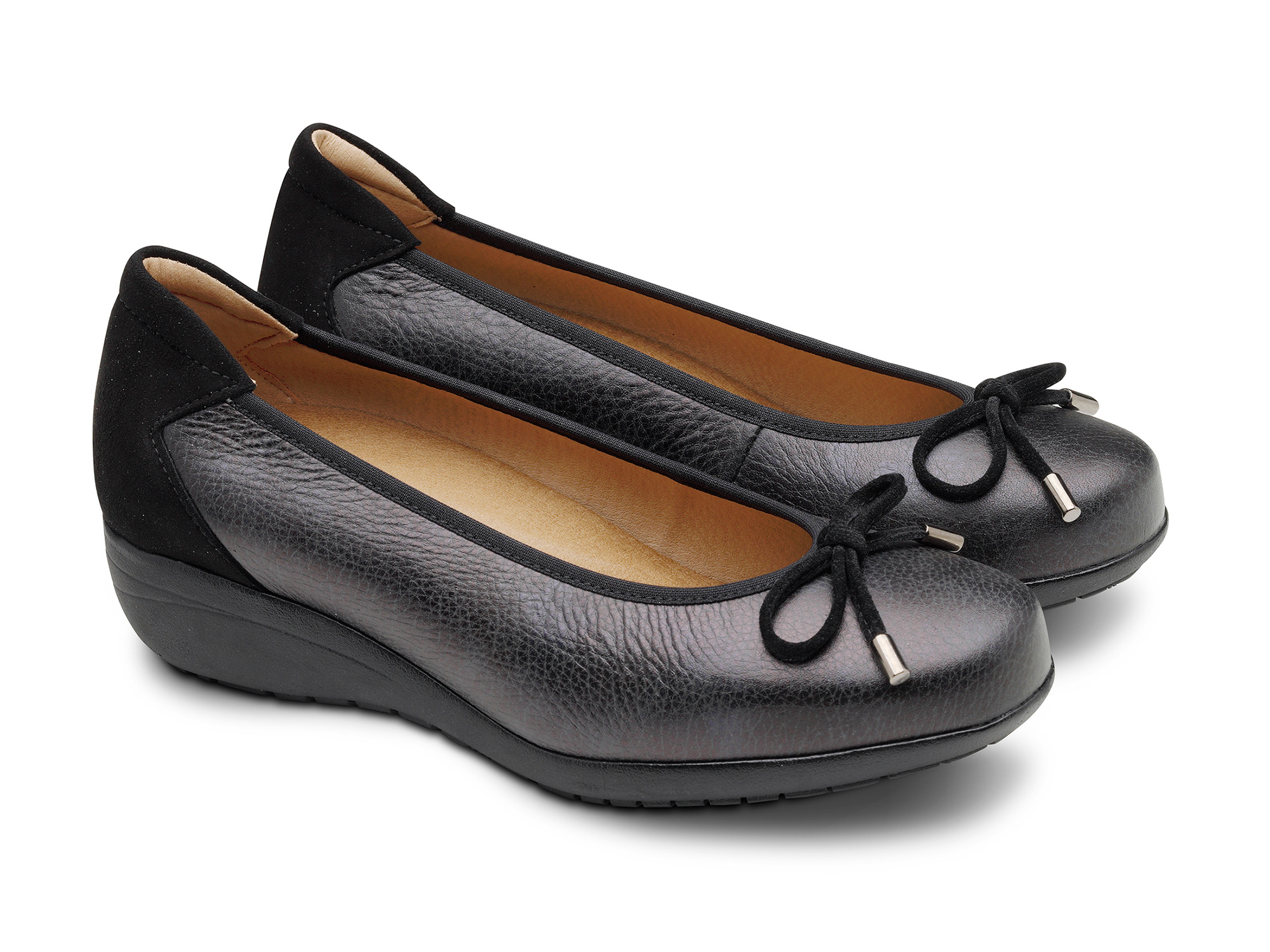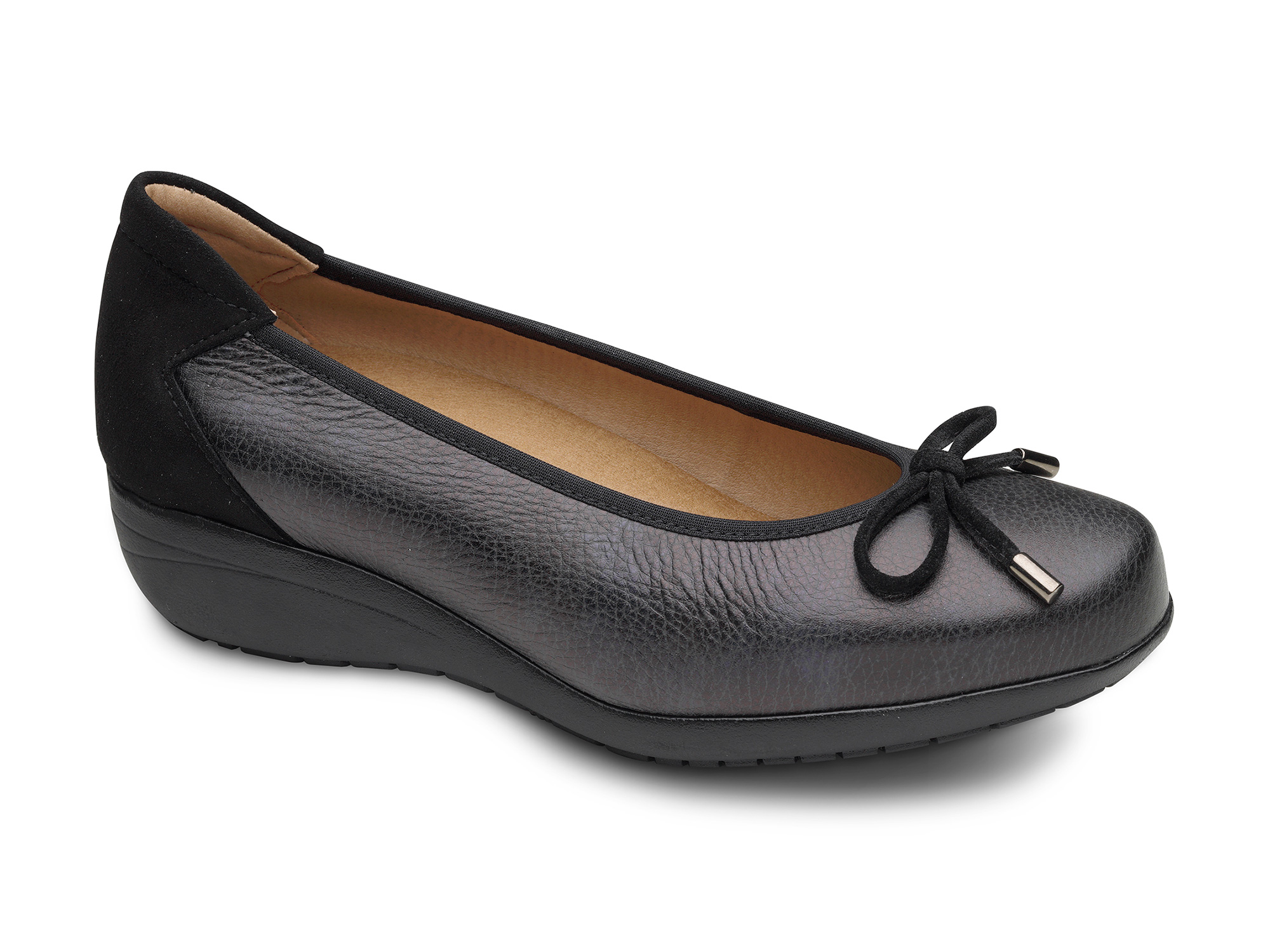Bailarina con cuña de 2,5 cm.Fabricado en piel y talonera en ante. Ancho especial 14I y alto de la cuña de 2.5 cm. Plantilla extraíble.