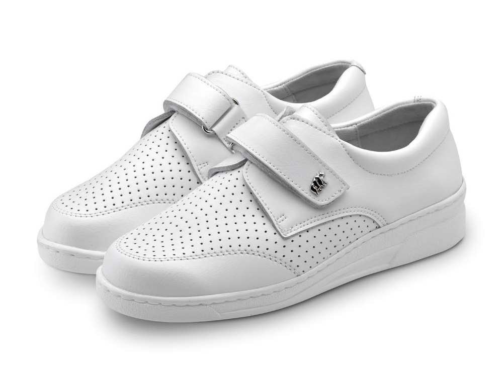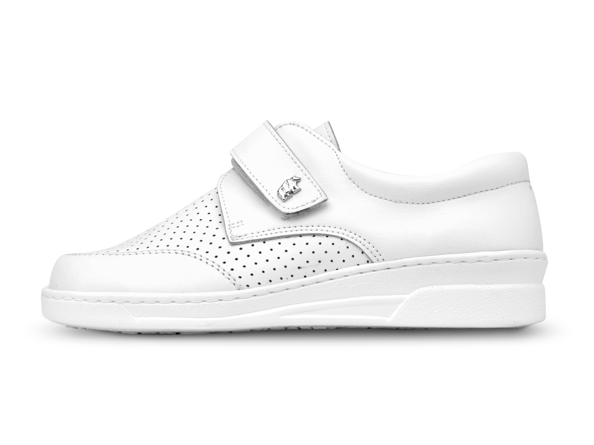 Calzado cómodo unisex con cierre de velcro ajustable. La pala picada, fabricada en piel de vacuno y el forro transpirable de piel confieren una solución fresca y anatómica a los profesionales que pasan muchas horas de pie durante el día. Lleva suela de poliuretano antideslizante, cosida y pegada que aumenta la flexibilidad y durabilidad del calzado. La plantilla extraíble que incorpora, permite la absorción del impacto que se produce en cada pisada, reduciendo el cansancio y molestias en las extremidades inferiores y espalda.